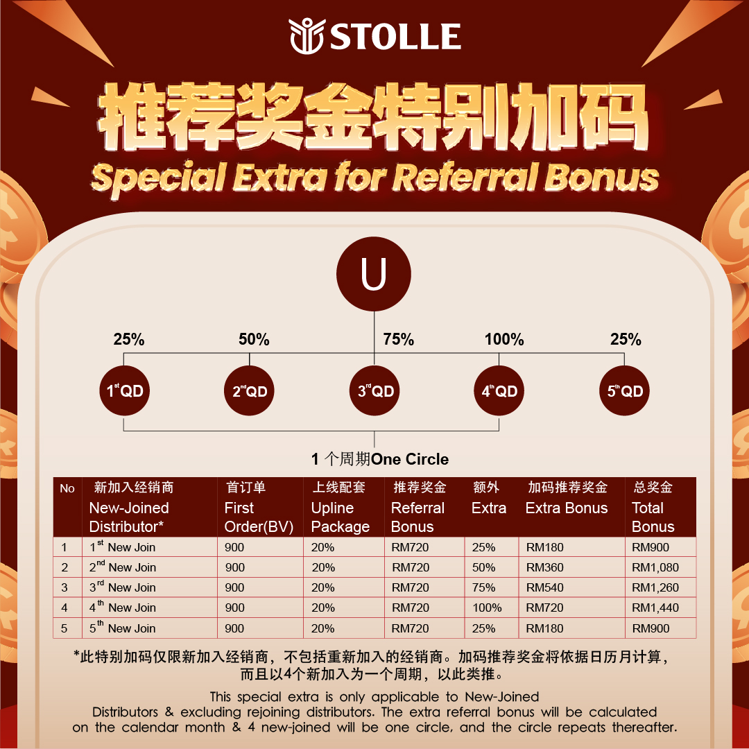 凡于本月(4月)内推荐新加入经销商,有关推荐者除了可获得推荐奖金之外,还可以赚取额外25%的加码推荐奖金,而且推荐越多,所获的额外加码推荐奖金就越多,最高达100%!