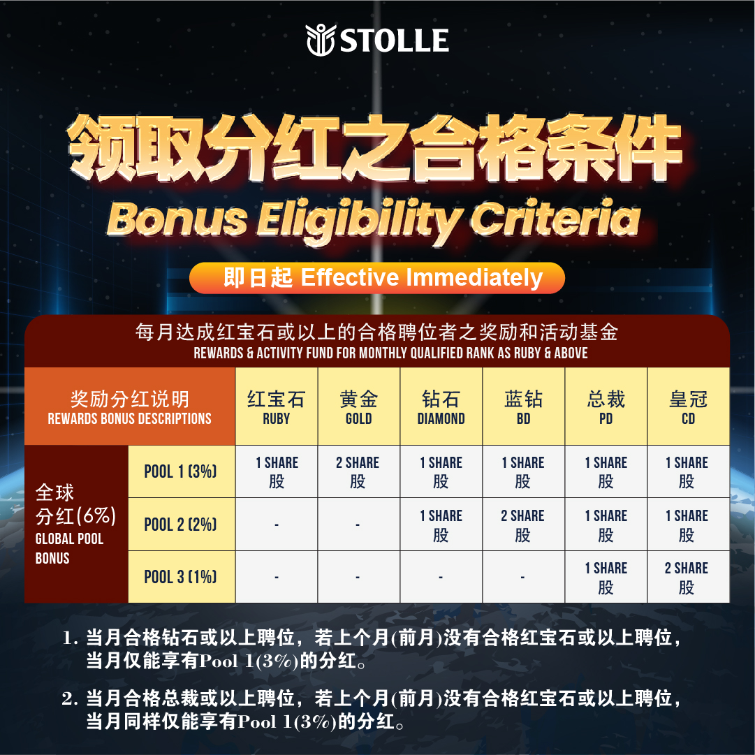 为鼓励更多经销商维持合格红宝石或以上聘位,即日起此奖励制度将有所调整,合格经销商须符合以下条件方可享有Pool 2和Pool 3个别的全球分红配額